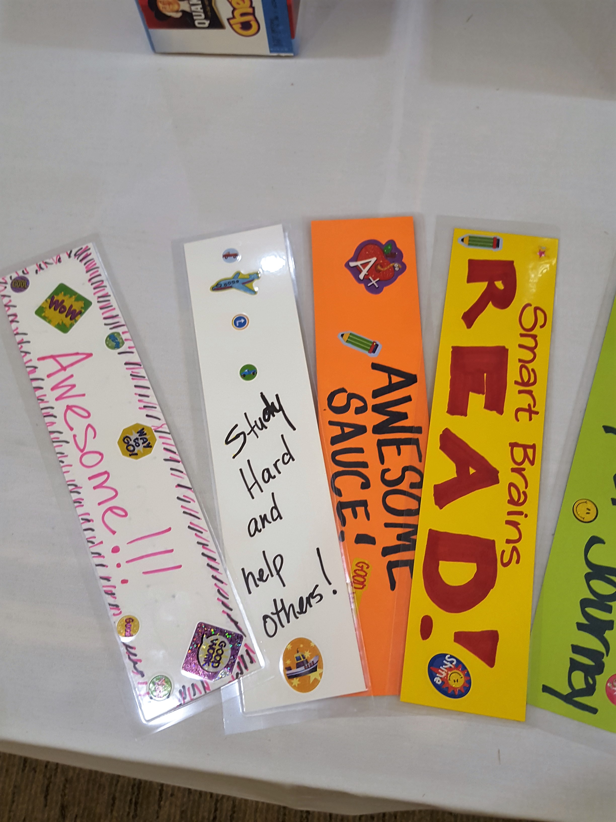 In the backpacks will be placed in the middle of the table where the cards of encouragement and backpacks will be decorated then we have the participants move through the assembly line to fill the packs. The teams also make bookmarks, backpack name tags and decorate the teacher boxes.